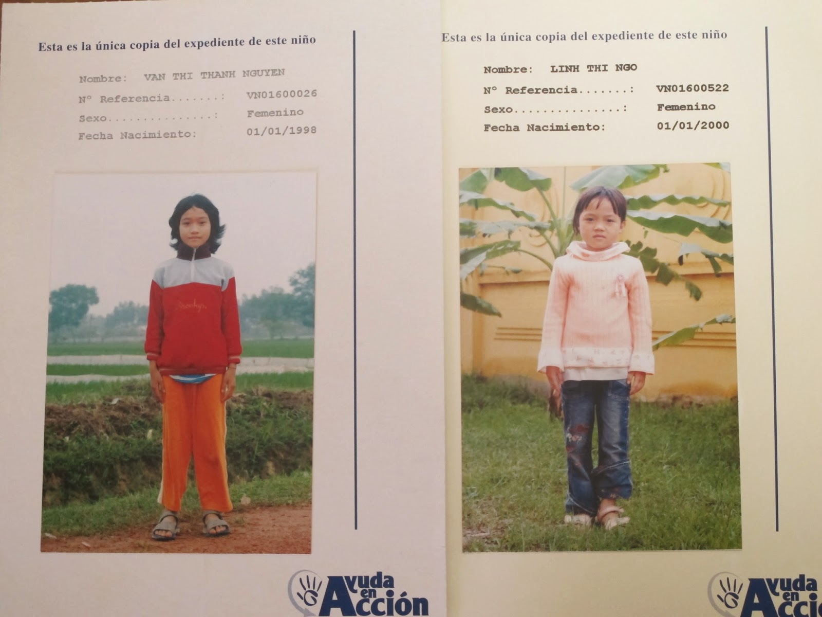Nuestros niños y niñas apadrinados son: Eliana, Floriano, Dien, Nishma, Chrystie, Evelyn, Quynh y Beatriz Adriana. Sus fotos y documentación están a disposición de quien desee conocer más sobre ellos.