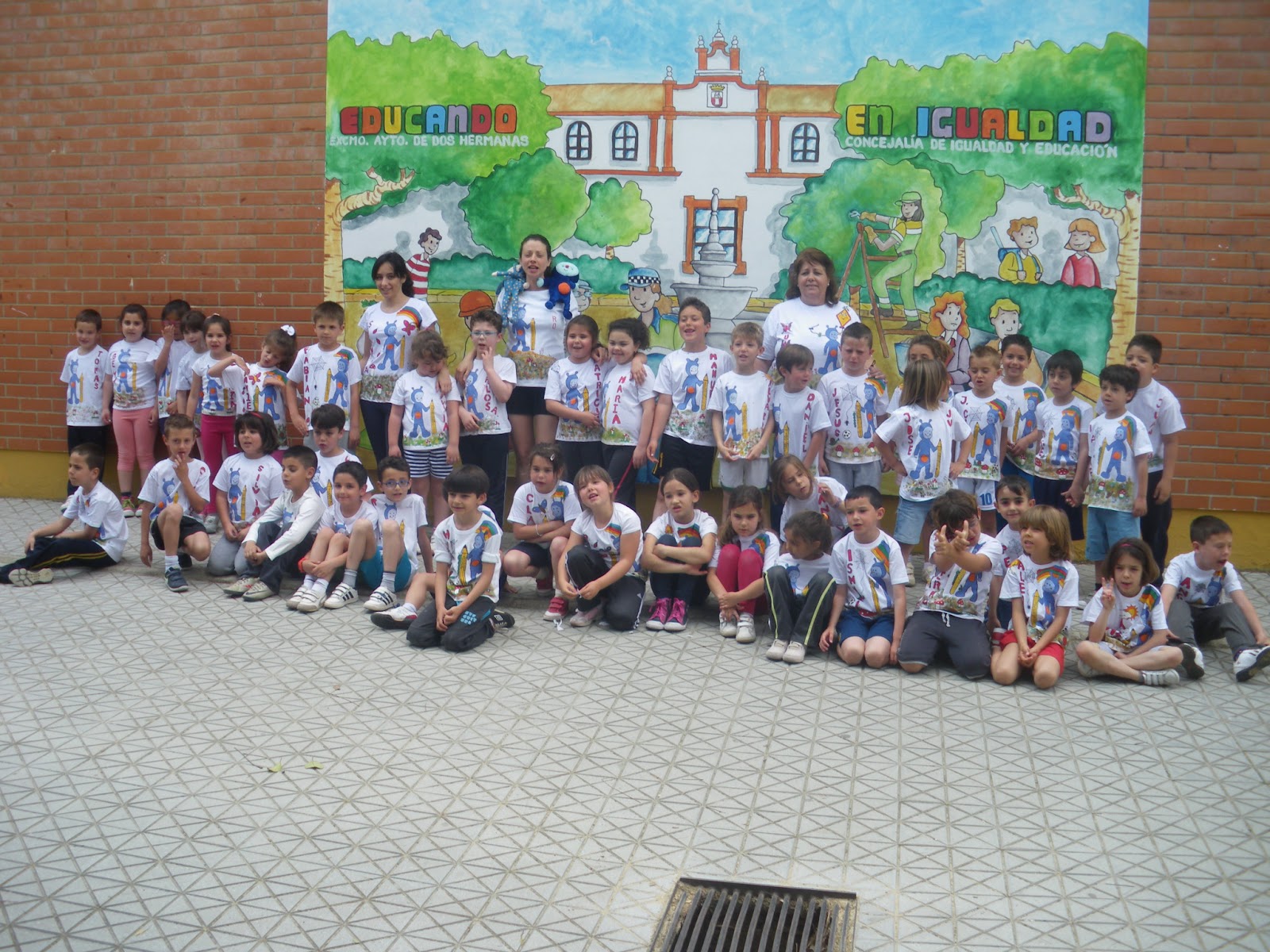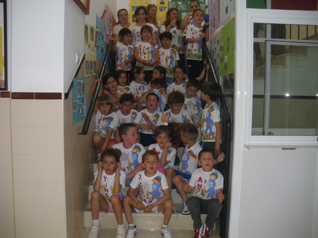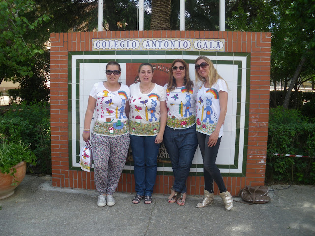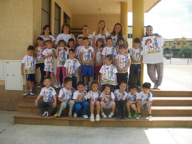 Madres, maestras y maestra en prácticas con nuestr@s niñ@s que han trabajado el taller de camnisetas. 1º de Primaria. Colegio Antonio Gala.